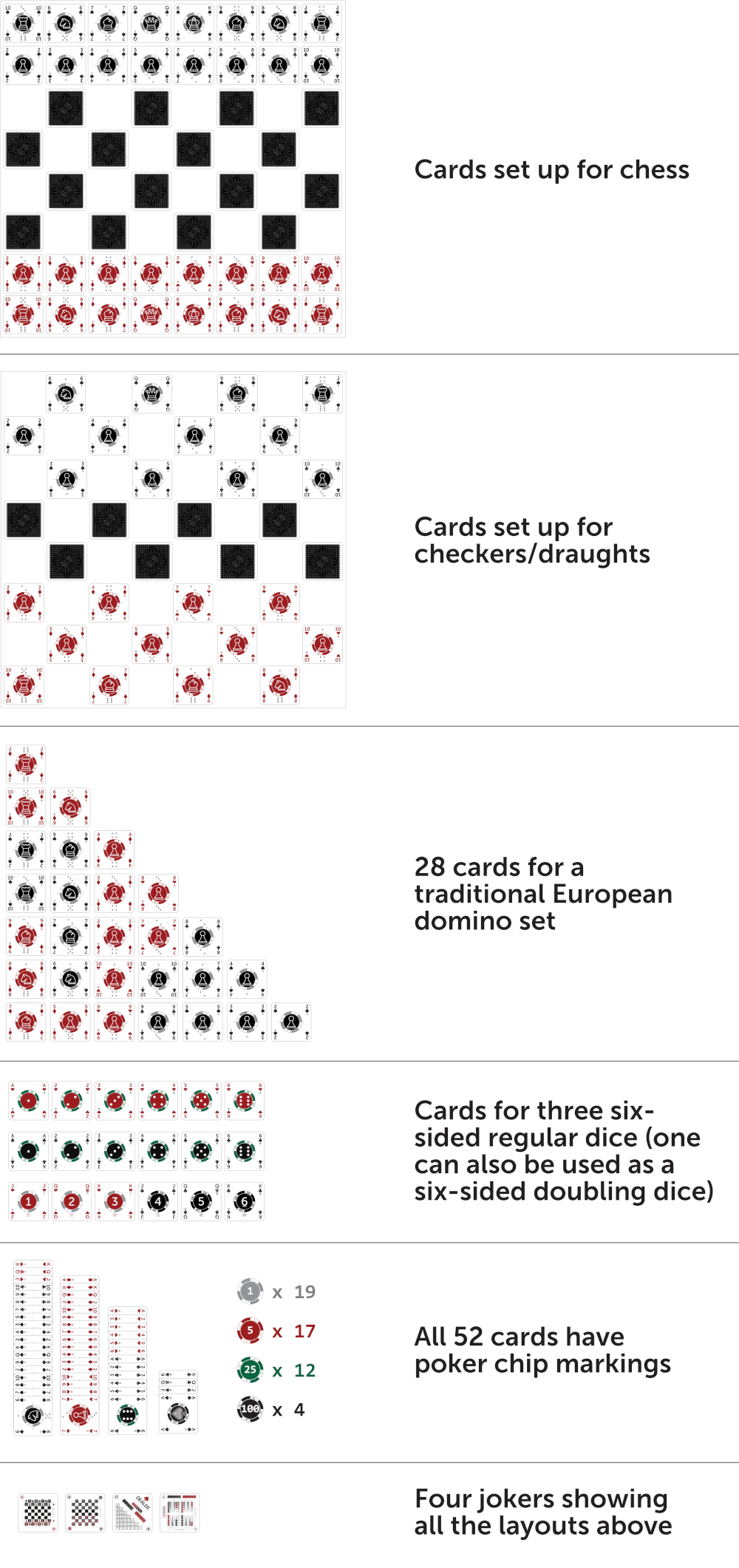 Beyond playing card games, here's an overview of the cards shown configured for different games.